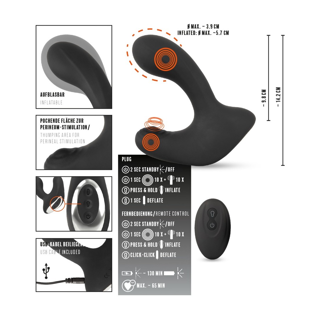 Il plug può essere gonfiato facilmente al tocco di un pulsante - per una sensazione meravigliosamente piena e un perfetto allenamento all'allungamento anale. Con il pratico telecomando, le 10 diverse modalità di vibrazione e picchiettio pulsante, così come la funzione di rilascio della pressione dell'aria, possono anche essere comodamente controllate con il tocco di un pulsante. Con una portata fino a 8 metri, anche dal tuo partner.