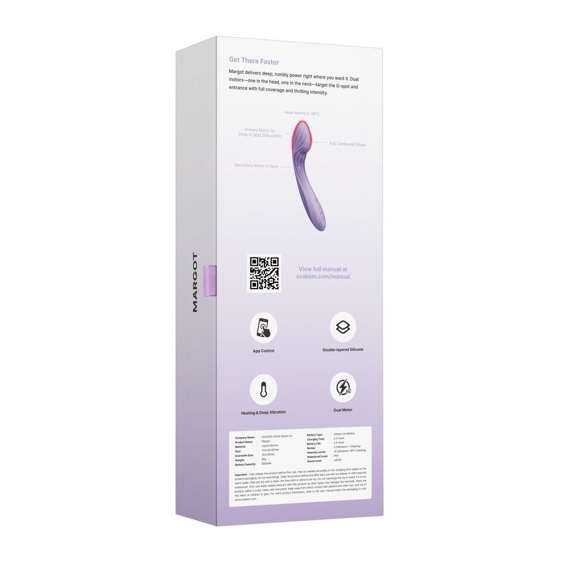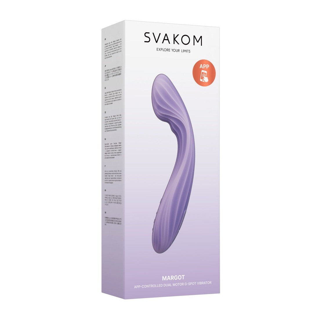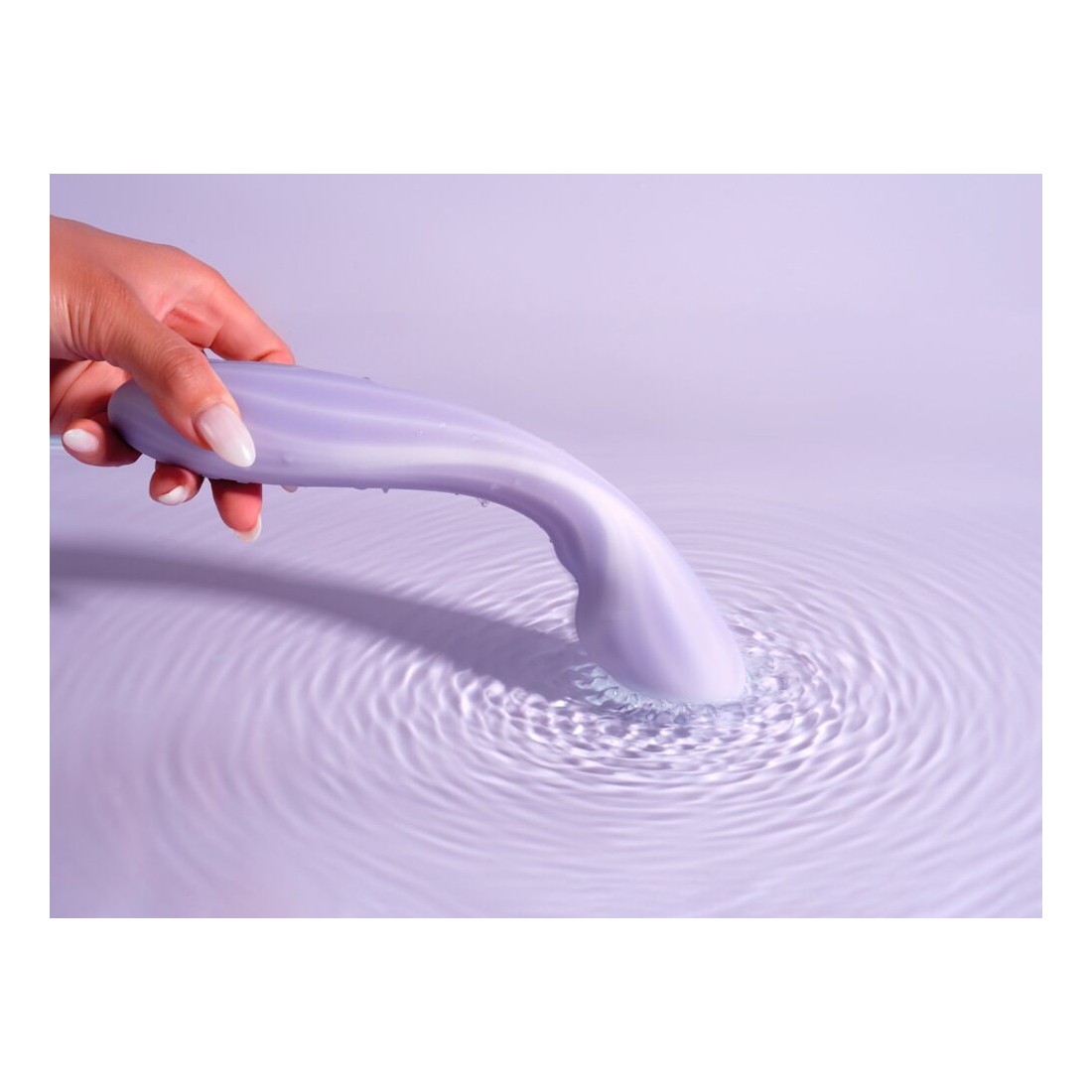 Vibratore per il punto G a doppio motore Margot di SVAKOM, controllato tramite app. Ergonomicamente perfettamente curvo e con una testa appiattita per una stimolazione mirata dei punti di piacere all'interno e all'esterno del corpo. In particolare, la zona G e il clitoride godono di un massaggio intensivo! Anche le delicate strutture a onda intensificano il tocco. Il vibratore in silicone a doppio strato, morbido e setoso, scivola sulla pelle e nelle profondità intime come per magia. Vi coccola con un'enorme varietà di vibrazioni con la semplice pressione di un pulsante. L'elegante leggerezza può essere facilmente ed eccitantemente incorporata in qualsiasi gioco solitario o d'amore. Anche nella vasca e nella doccia, perché Margot è impermeabile.