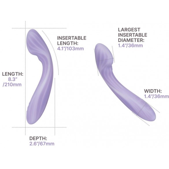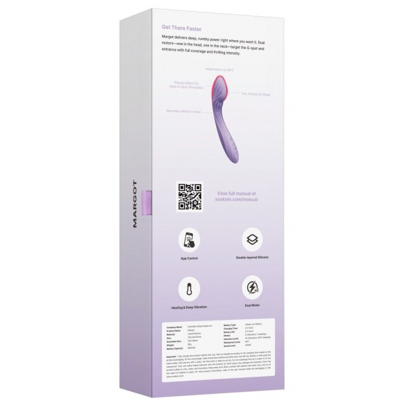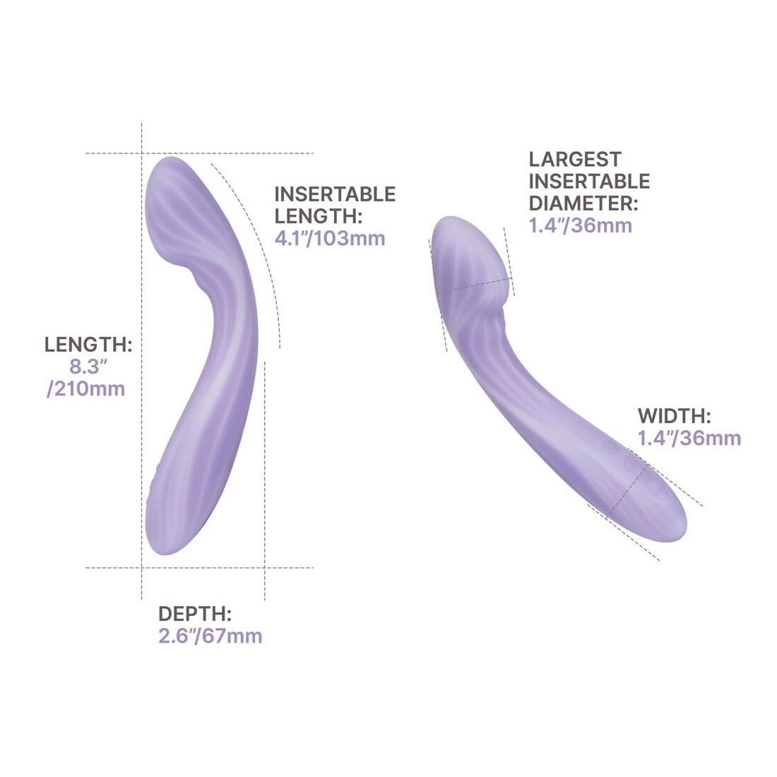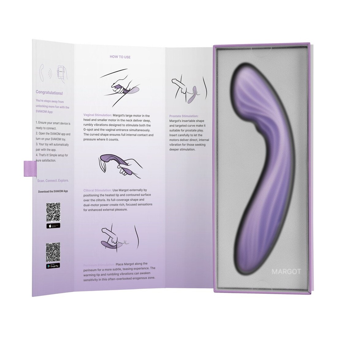 Vibratore per il punto G a doppio motore Margot di SVAKOM, controllato tramite app. Ergonomicamente perfettamente curvo e con una testa appiattita per una stimolazione mirata dei punti di piacere all'interno e all'esterno del corpo. In particolare, la zona G e il clitoride godono di un massaggio intensivo! Anche le delicate strutture a onda intensificano il tocco. Il vibratore in silicone a doppio strato, morbido e setoso, scivola sulla pelle e nelle profondità intime come per magia. Vi coccola con un'enorme varietà di vibrazioni con la semplice pressione di un pulsante. L'elegante leggerezza può essere facilmente ed eccitantemente incorporata in qualsiasi gioco solitario o d'amore. Anche nella vasca e nella doccia, perché Margot è impermeabile.
