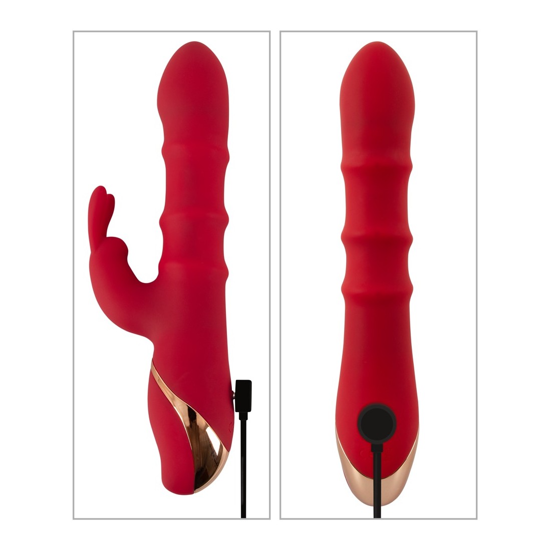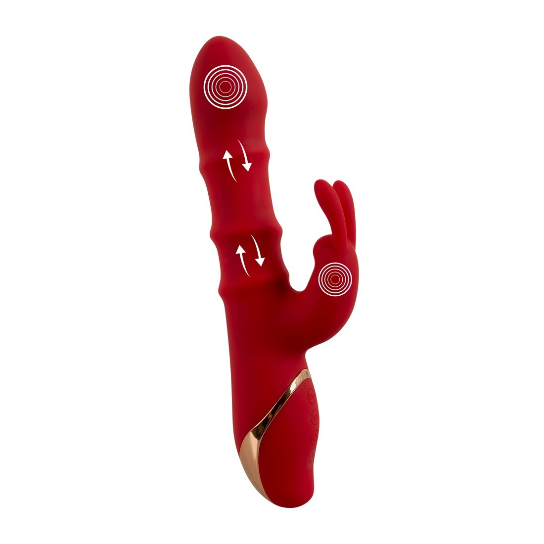 Il pratico vibratore Rabbit con 3 anelli mobili di You2Toys stimola due centri del piacere contemporaneamente! All'interno della vagina con vibrazioni intense e i 3 anelli massaggianti a sfera che si muovono diametralmente (anelli mobili). E all'esterno, il clitoride con vibrazioni dinamiche. Doppio piacere per un doppio climax!