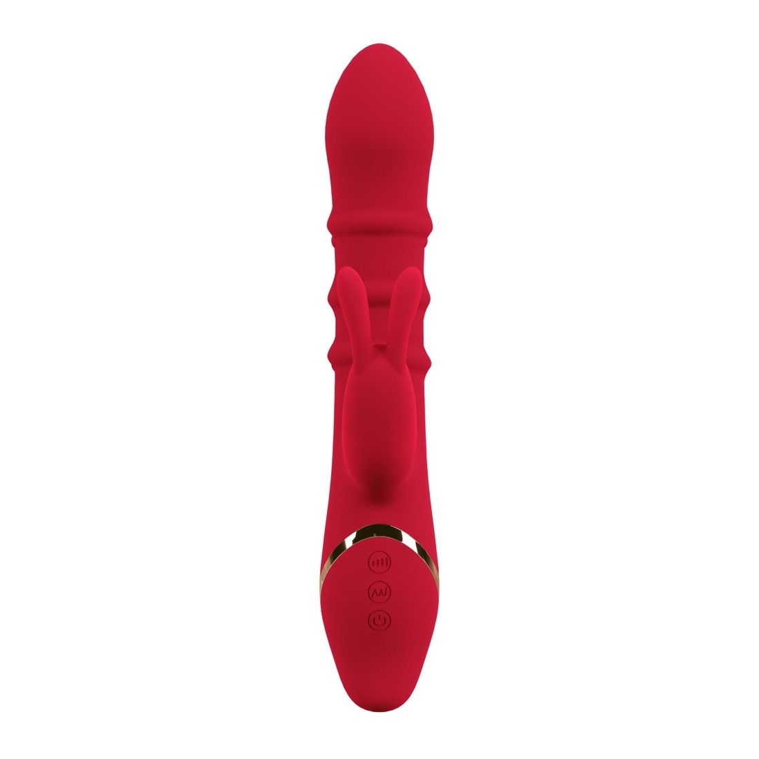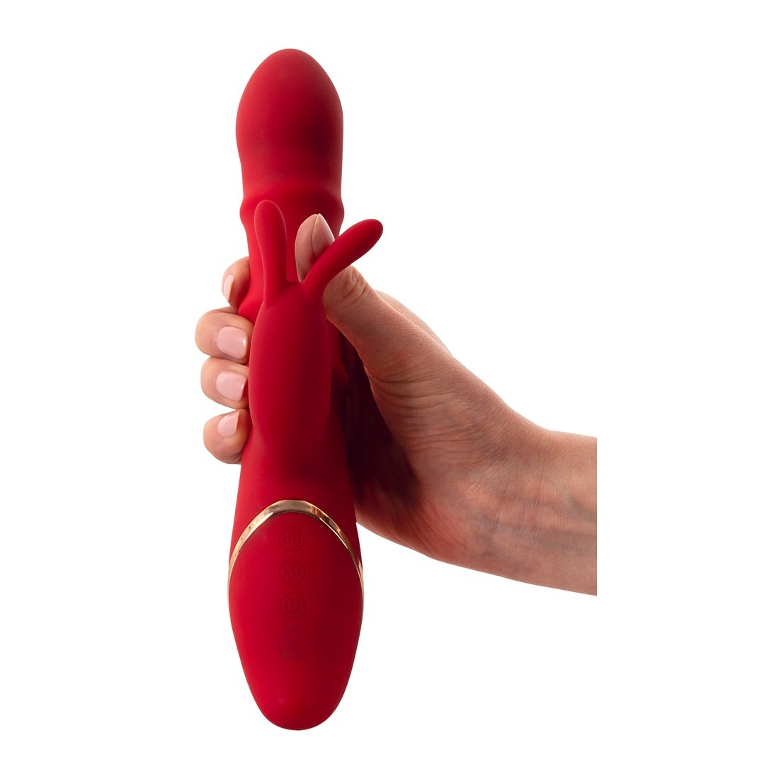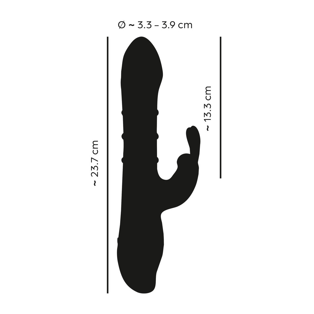 Per la sofisticata doppia stimolazione, sono disponibili 3 modalità di massaggio degli anelli mobili nell'asta e 10 modalità di vibrazione nella punta rigonfia e nel coniglietto del clitoride. Le funzioni possono essere comodamente controllate direttamente sul toy con la semplice pressione di un pulsante, separatamente o combinate in modo eccitante. Due potenti motori garantiscono una potenza affidabile.