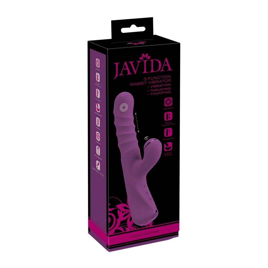 Il pratico vibratore Rabbit a 3 funzioni di Javida, con funzione di spinta e di picchiettamento, coccola dentro e fuori allo stesso tempo! Il suo fusto scanalato a ripetizione con punta vibrante stimola profondamente la vagina. Allo stesso tempo, l'asta pulsante e pulsante si rivolge al clitoride. Tripla potenza orgasmica con la semplice pressione di un pulsante!