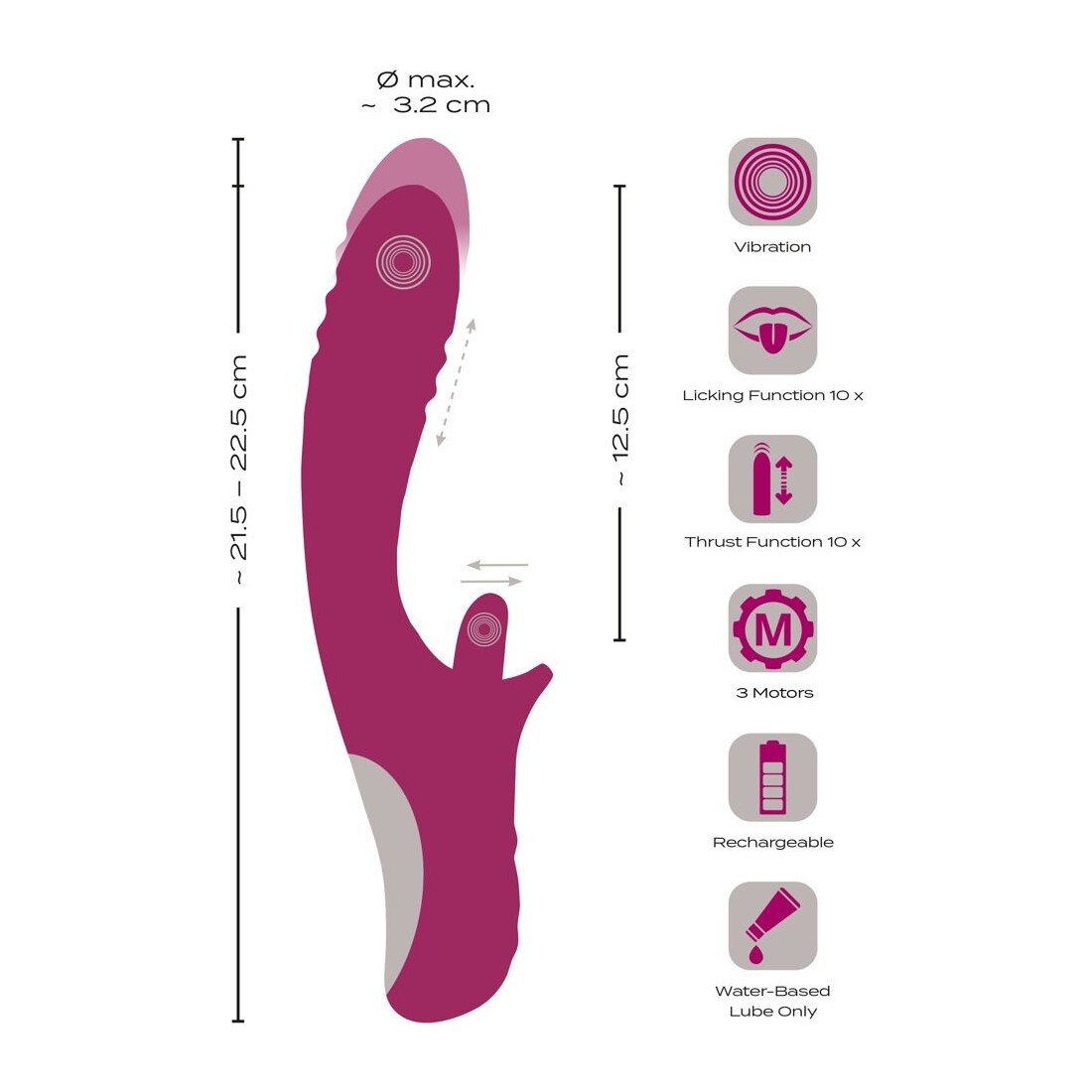 3 motori silenziosi e potenti forniscono una potenza affidabile per la doppia stimolazione. La morbida lingua vibrante si muove avanti e indietro a 10 velocità selezionabili. Anche la funzione di spinta della punta dell'albero vibrante può essere comodamente controllata in 10 modalità con la semplice pressione di un pulsante. Per una potenza immediata, il vibratore si avvia in modalità turbo con le due modalità più forti. Le funzioni di leccamento e di spinta possono essere controllate in modo intuitivo e separato con la semplice pressione di un pulsante.