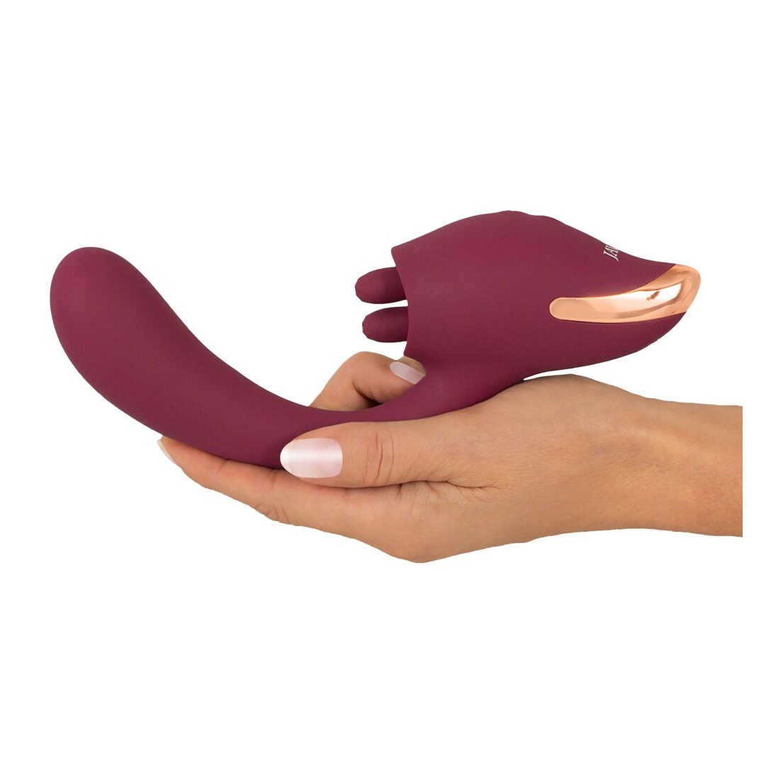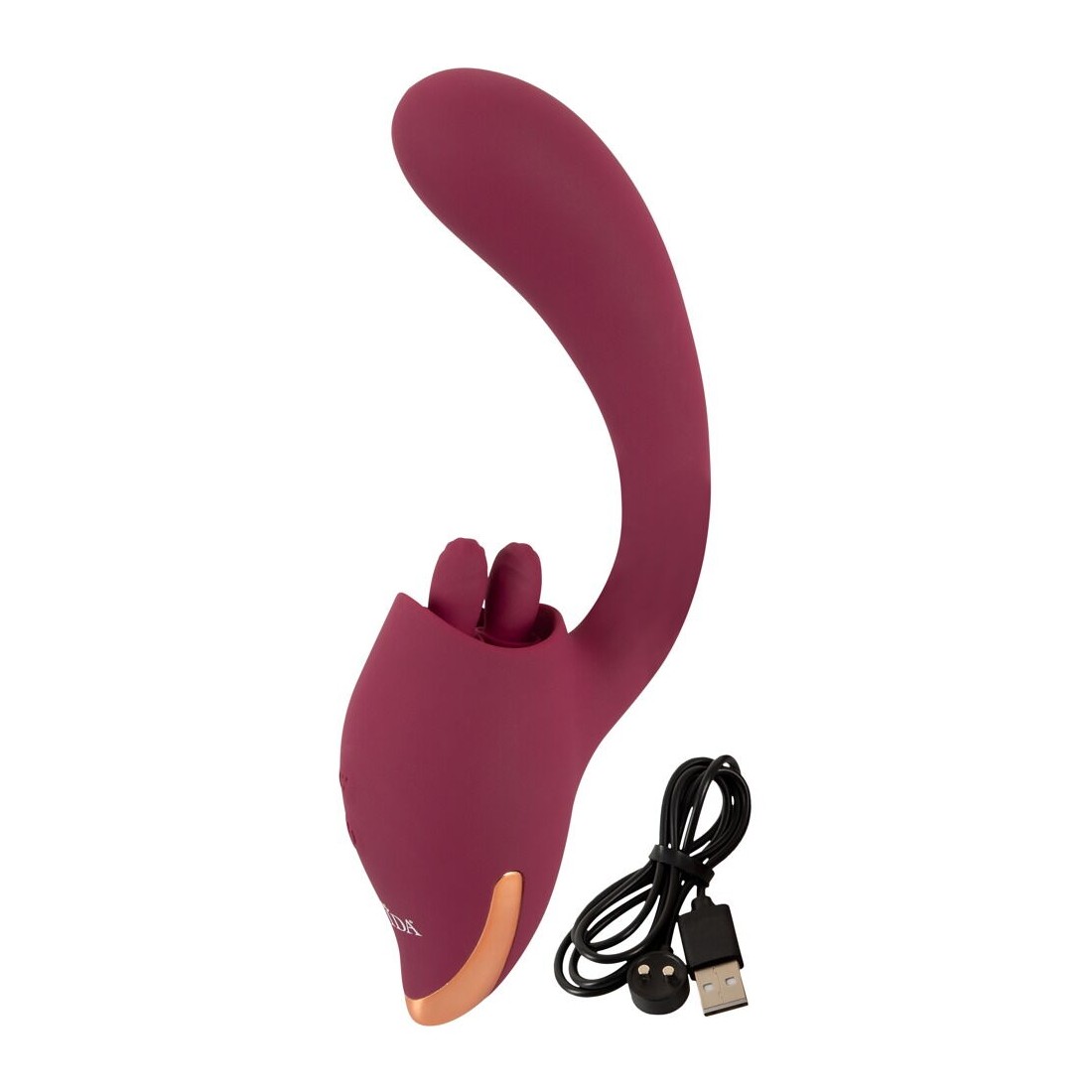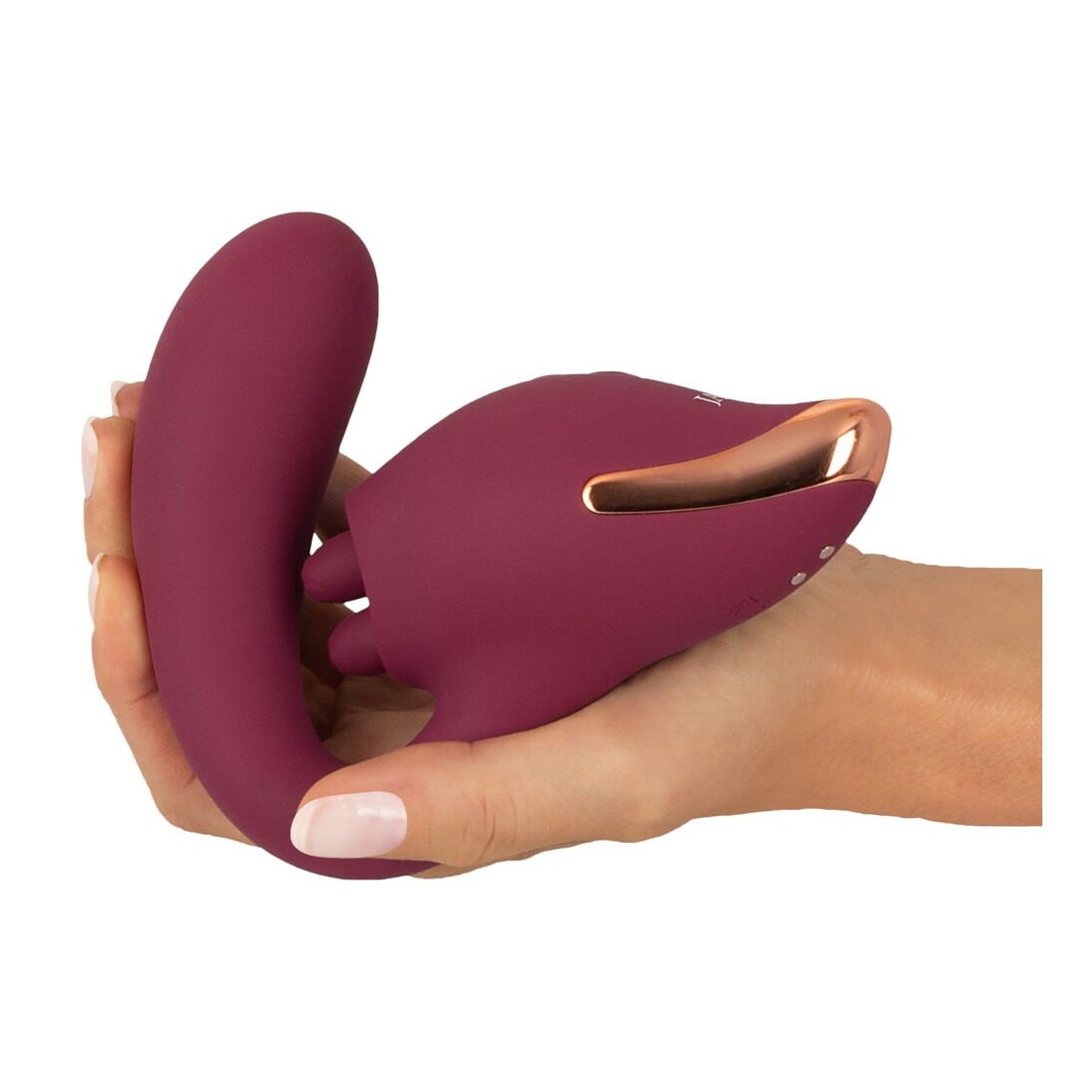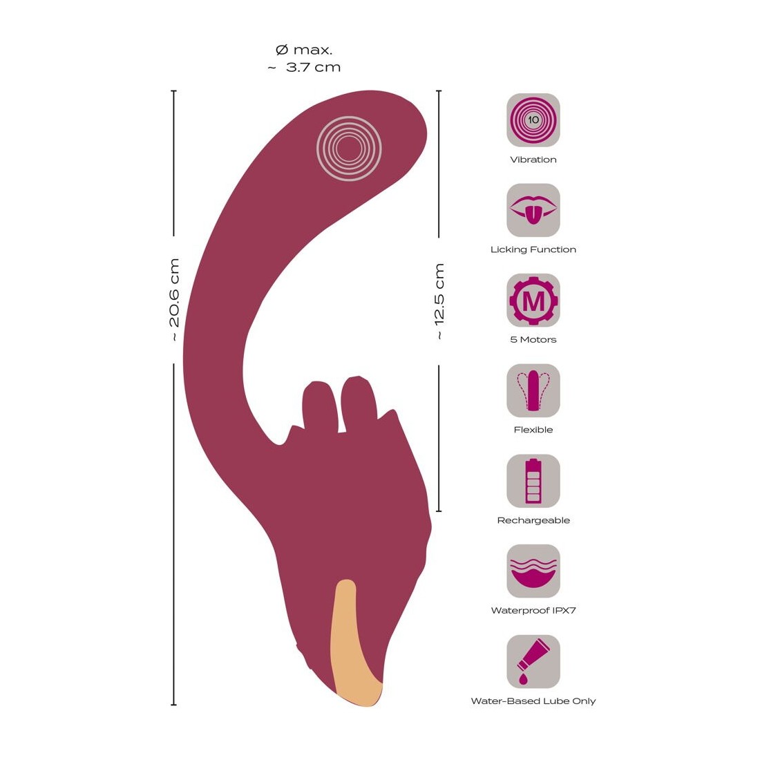 Un totale di 5 potenti motori assicurano una doppia stimolazione affidabile e potente. 10 modalità di vibrazione nella testa del fusto curvo e 10 modalità di leccata della doppia lingua mobile offrono un piacere variegato. Le due funzioni possono essere comodamente controllate direttamente sul toy con la semplice pressione di un pulsante, separatamente o combinate in modo eccitante.