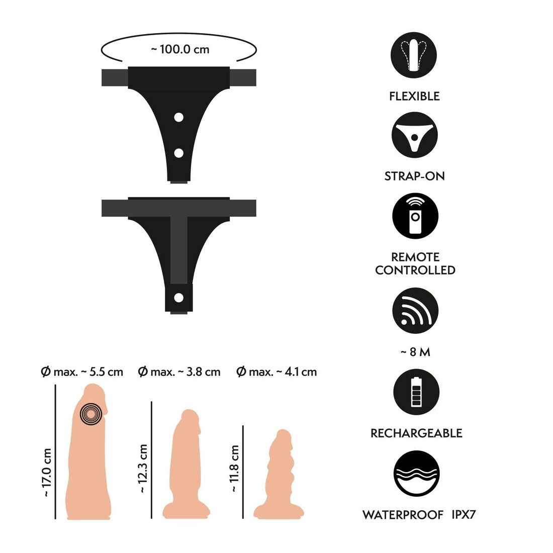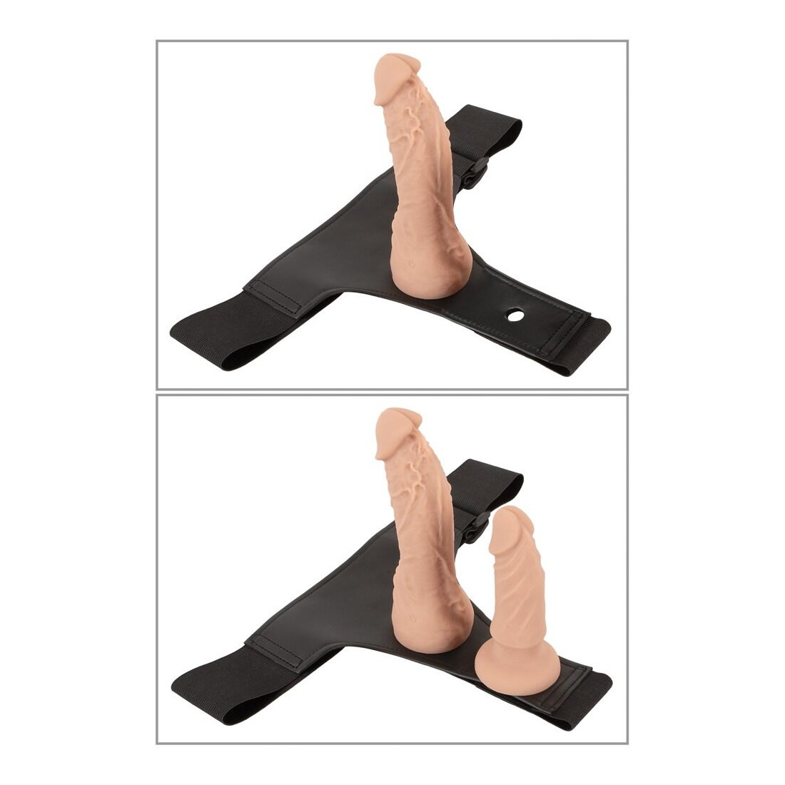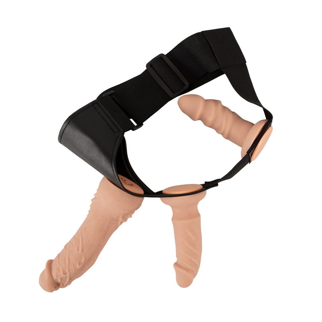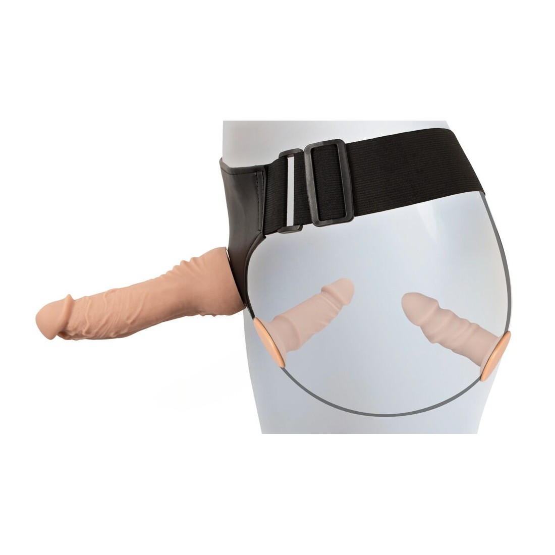 Il perizoma strap-on, realizzato in elegante ecopelle con ampie fasce elastiche, è regolabile nelle dimensioni in modo da adattarsi perfettamente e comodamente. Il vibratore e i dildo si avvitano semplicemente nelle 3 aperture del perizoma con le rispettive contropiastre, come desiderato.