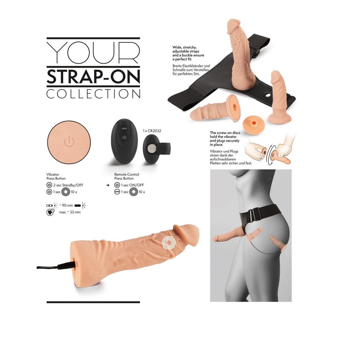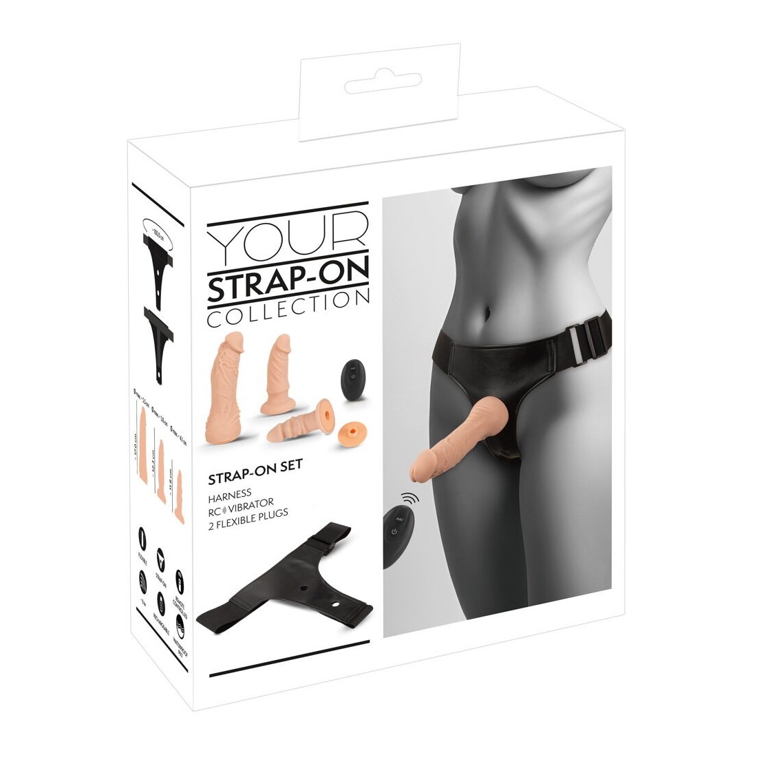 set di 4 pezzi della Your Strap-On Collection di You2Toys con perizoma strap-on regolabile, vibratore naturale con telecomando e 2 diversi dildo naturali. Il vibratore e i dildo possono essere facilmente fissati all'interno e/o all'esterno del perizoma. In questo modo, chi lo indossa è coccolato vaginalmente e analmente allo stesso tempo - e può anche spingere forte con il pene esterno. Doppio e triplo divertimento per due!