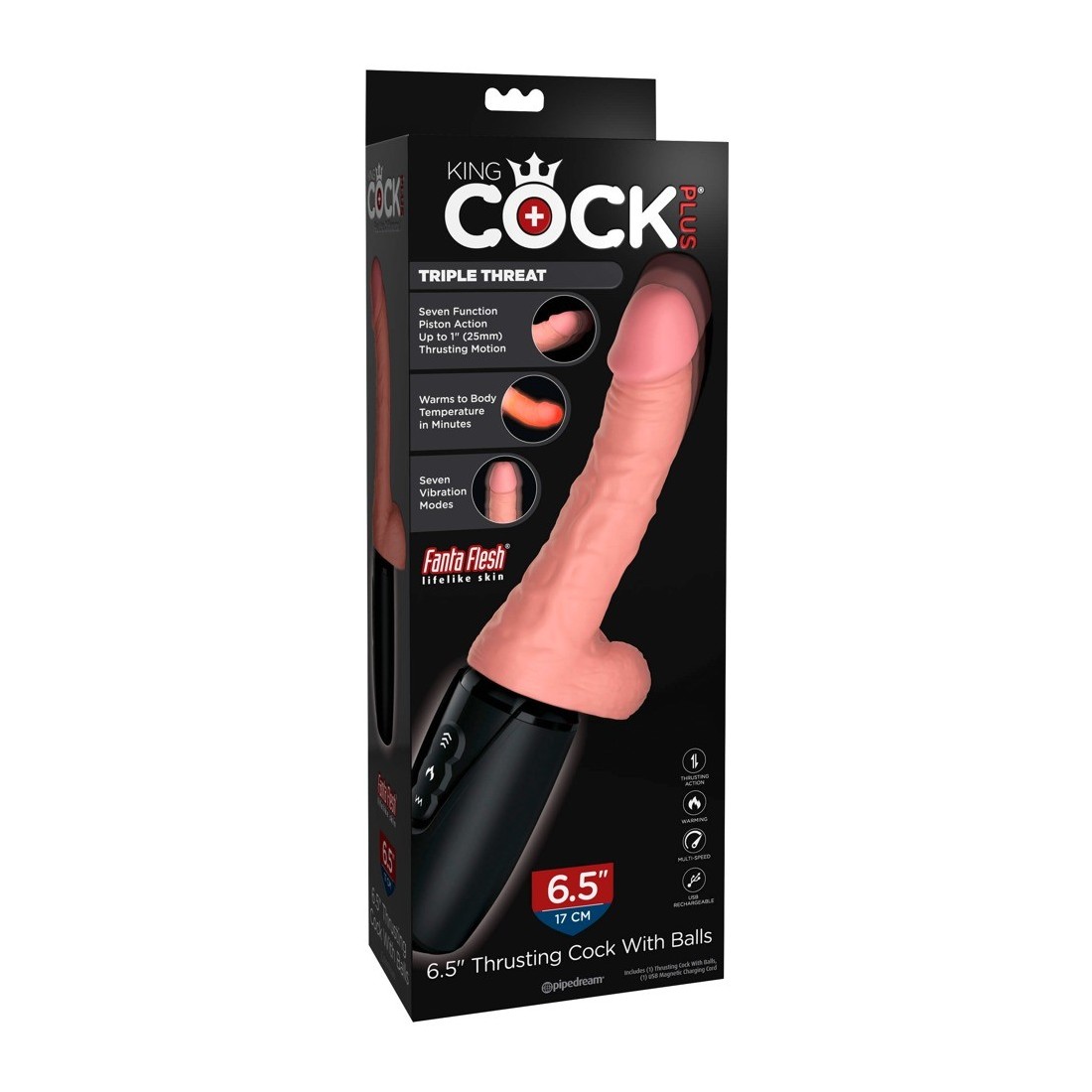 Vibratore con la forma di un pene in erezione che pu anche spingere in avanti ed indietro (2.5 cm) ed inoltre pu scaldarsi alla temperatura del tuo corpo in brevissimo tempo. Dotato di testicoli e di un manico comodo (5.5 cm) da prendere con decisione sul quale sono posti i tre pulsanti.