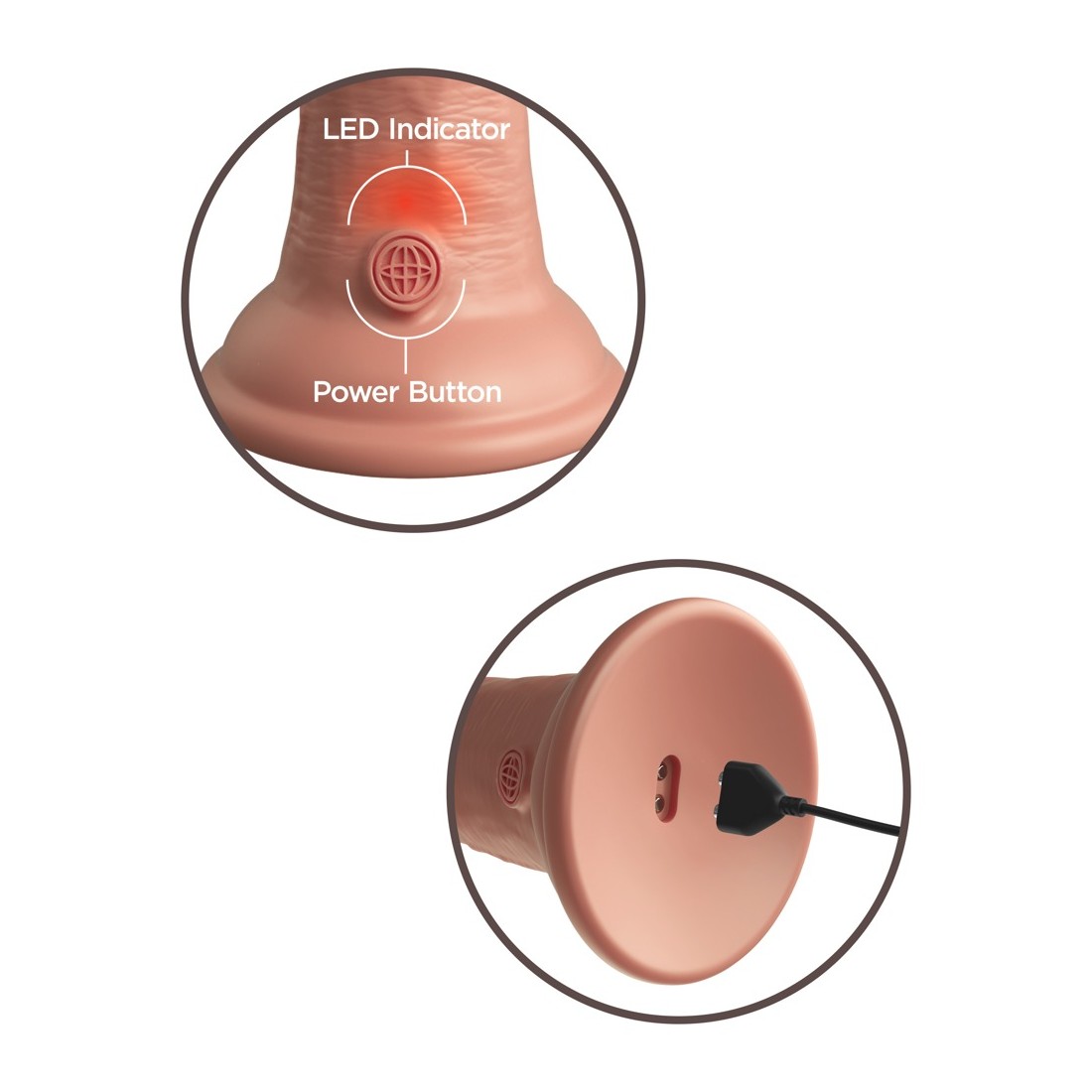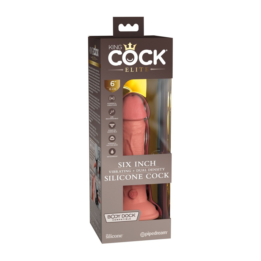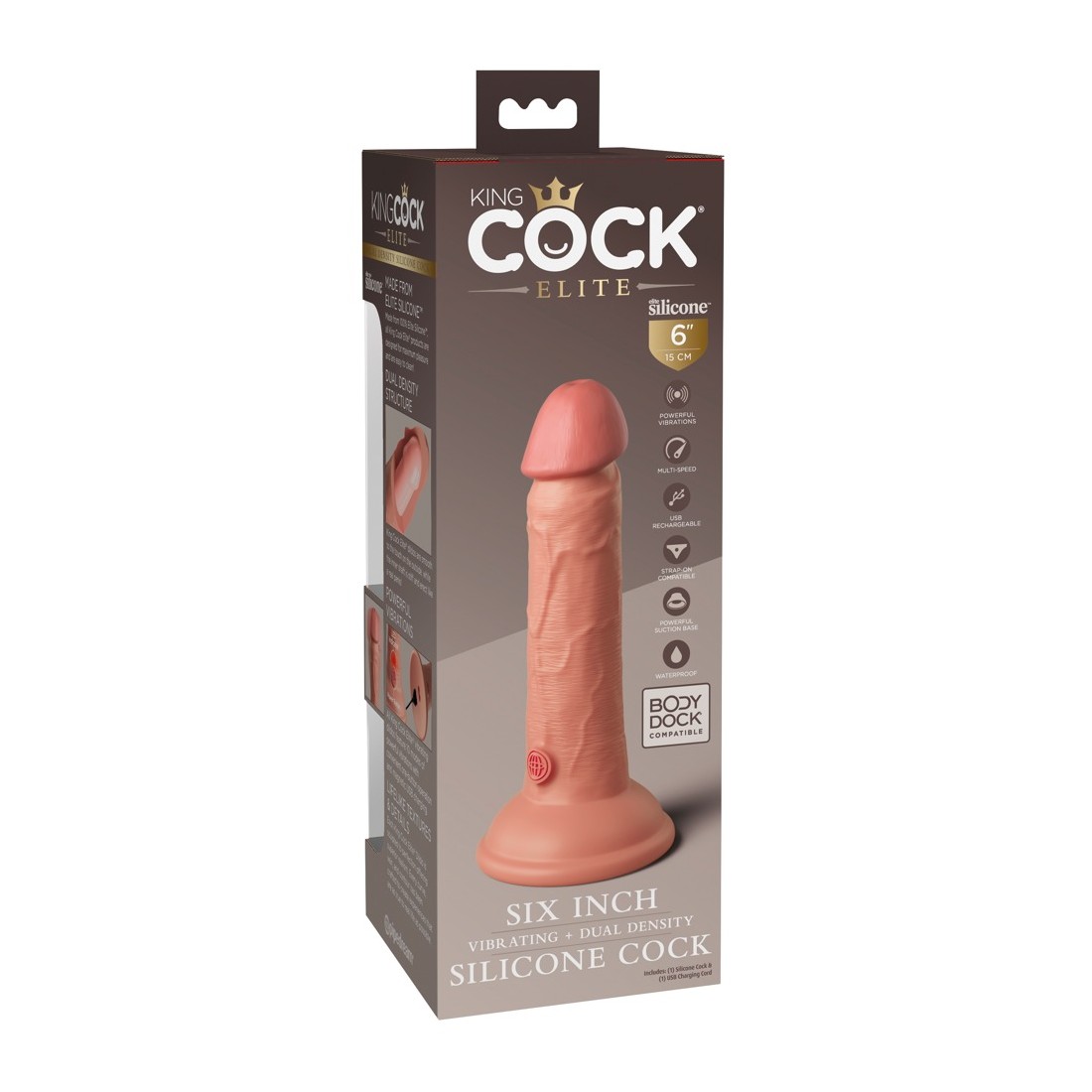 Vibratore naturale ricaricabile 6" vibrante + Dual Density Silicone Cock di King Cock Elite in look iper-realistico del pene fatto di materiale siliconico a doppia densità che si sente come la vera pelle. Il vibratore stesso (come un vero membro eretto) ha un'asta ferma, ma flessibile che rende l'esperienza di piacere il più realistica possibile.